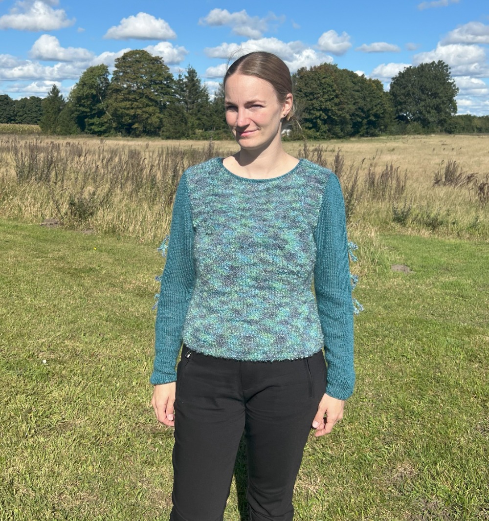 Blusen har taljering som gør den kropsnær, taljeringen kan udelades. Blusen strikkes i