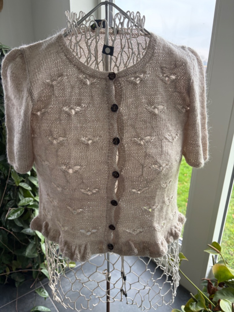 Blusen strikkes i to tråde Single kid mohair. Kroppen strikkes frem og tilbage på rundpind op til ærmegabet, hvor